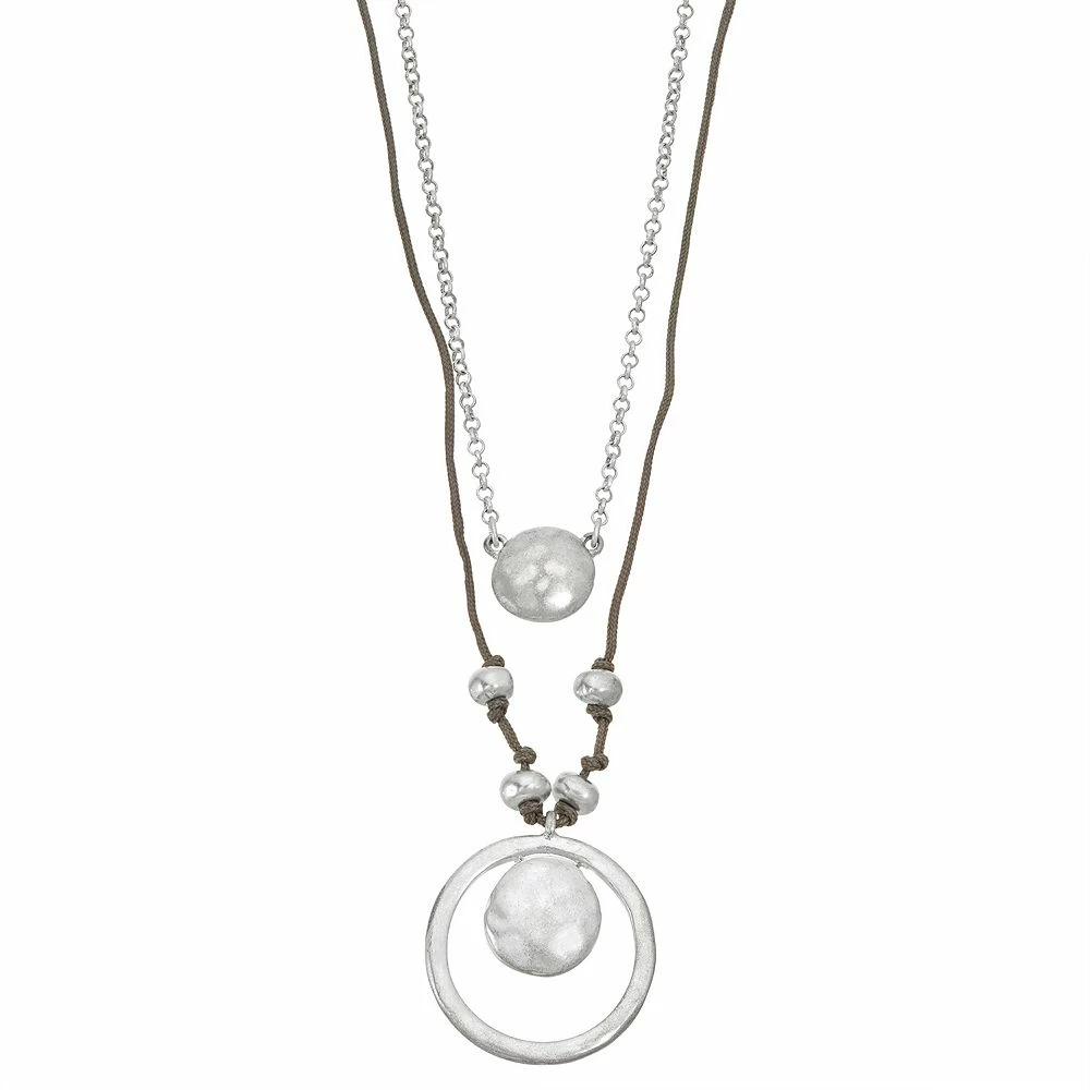 This Bella Uno disc necklace is a layered piece with 2 rows featuring a textured silver tone.