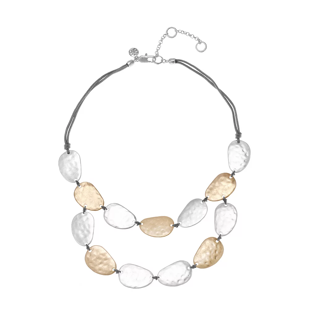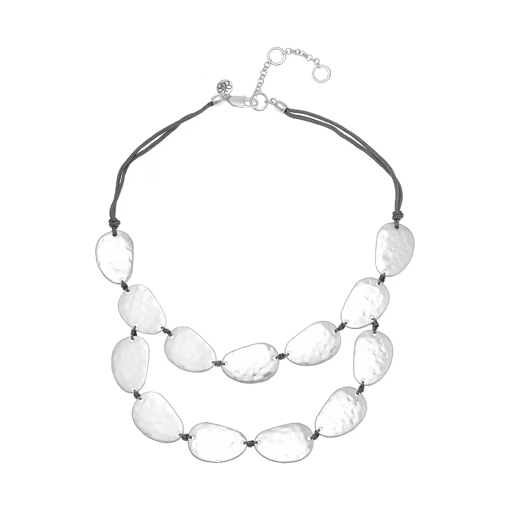 This Bella Uno two-row necklace features worn metal discs for a stylish look you’re sure to love!