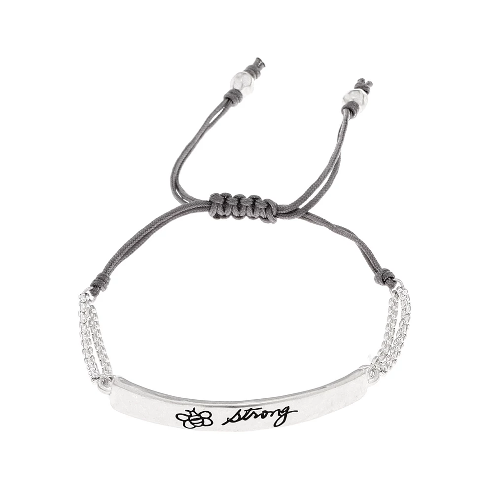 This beeautiful silver tone adjustable cord bracelet is a great reminder to keep your strength in the face of any difficulty.