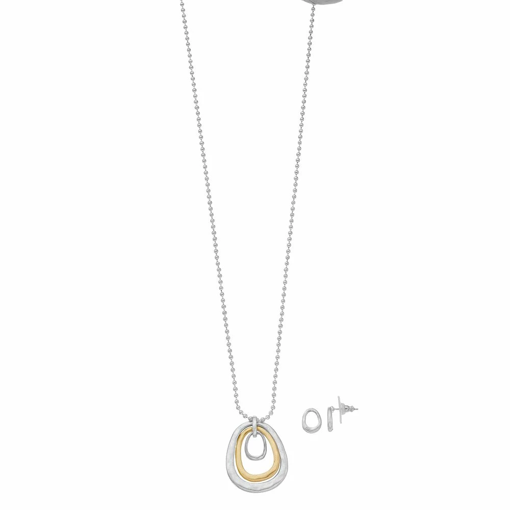 You’ll love the modern style of this two-tone hoop necklace and stud earring set from Bella Uno.